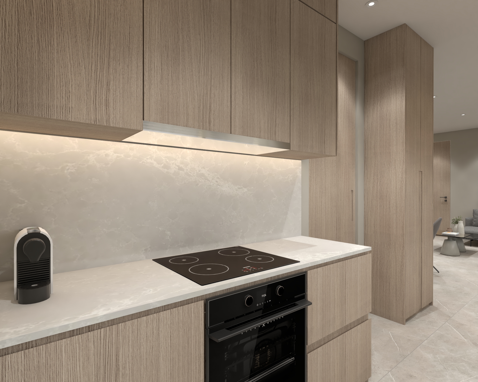 - Διάταξη ανοιχτού τύπου για την τραπεζαρία και την κουζίνα με εντοιχισμένες ηλεκτρικές συσκευές Siemens / Bosch
